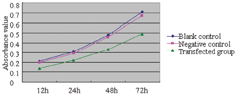The cellular activity in each group was determined using the MTT method 12, 24, 48, and 72 hours after transfection, from which growth curves were established and the relative cellular proliferation activities were calculated (Figure 2). It was found that the relative proliferation activity was 2.28±0.25%, 4.35±0.28%, and 4.62±0.31% in the 72-hour transfection group, negative control group, and blank group, respectively. Compared with the negative control group and blank group, the growth of MCF-7 cells was significantly inhibited in the transfection groups (P<0.01); however, no such difference was found between the negative control group and the blank group (P>0.05).