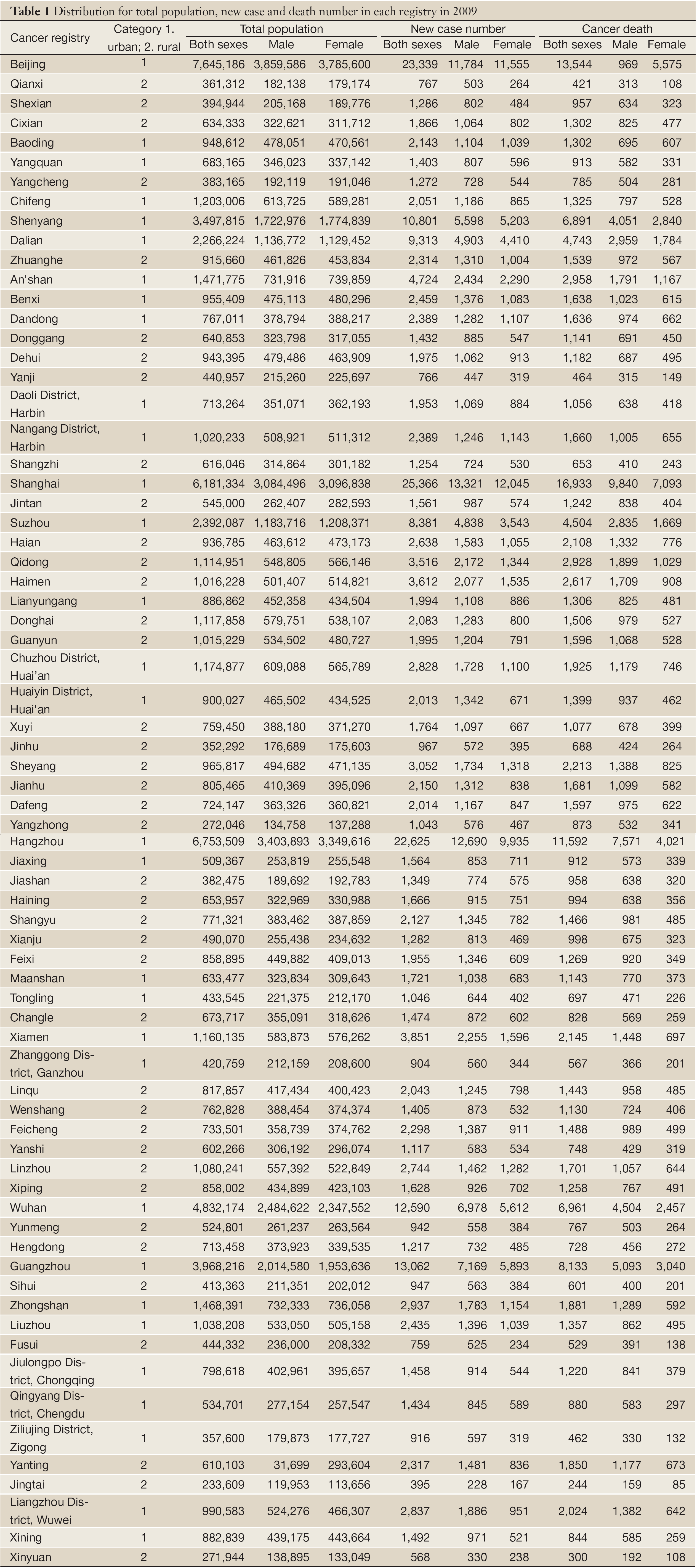 Total 72 registries, including 31 from urban and 41 from rural areas, met the criteria for data quality and then were pooled for national database in 2009. The population coverage of valid database was 85,470,522 (43,231,554 in male and 42,238,968 in female), with 57,489,009 in urban areas (67.26%) and 27,981,513 in rural areas (32.74%). The total cancer incident cases and deaths were 244,366 and 137,462, respectively (Table 1).