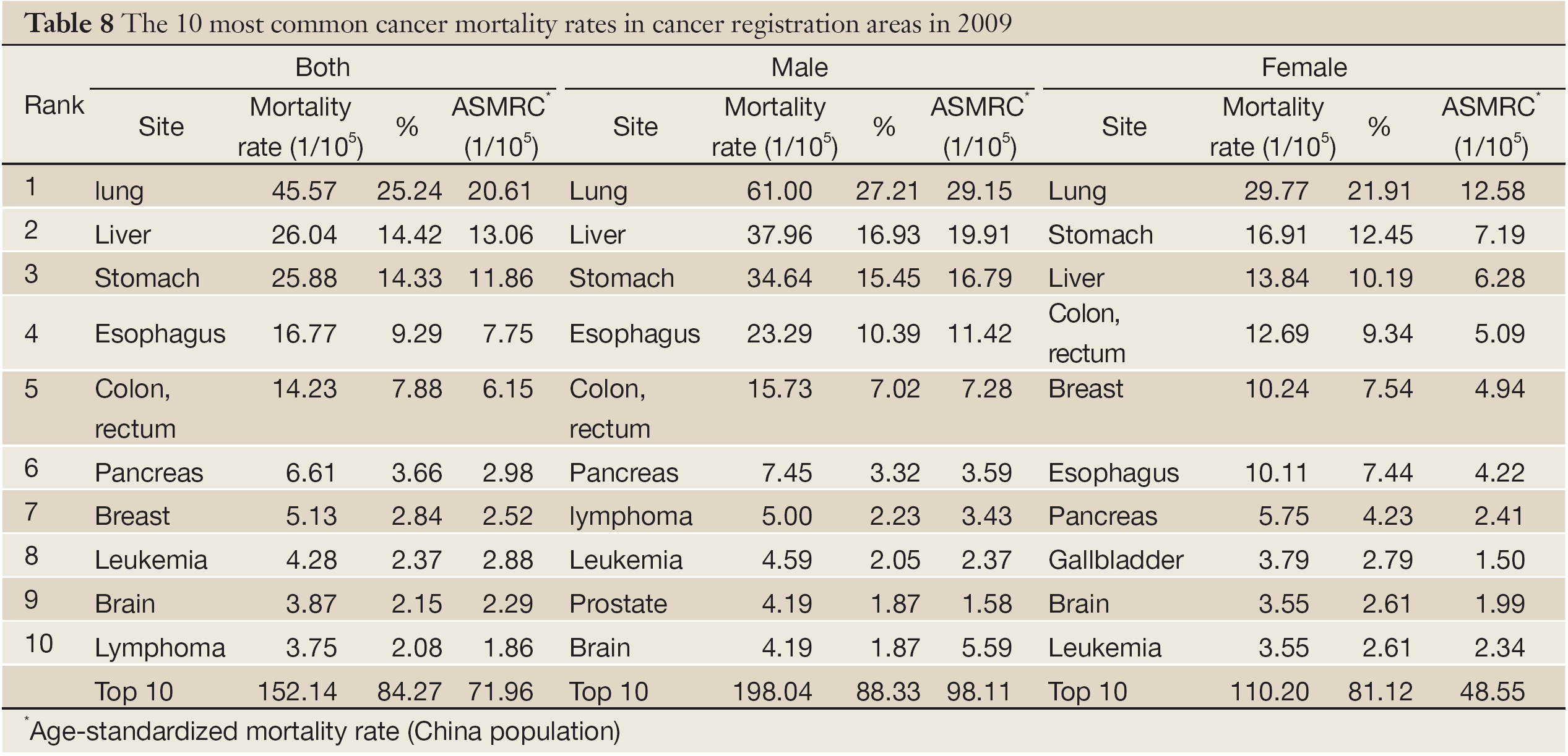 The statistics showing cancer incidence and mortality in 2009 were very close to the figures in 2008 (6). Although the included registries were quite different with the ones in last year, the overall incidence and mortality are reasonably stable, indicating that the pooled data was valid and could represent national cancer burden in national level. The representativeness of cancer registry in different groups, such as urban, rural, region, should be evaluated (7).