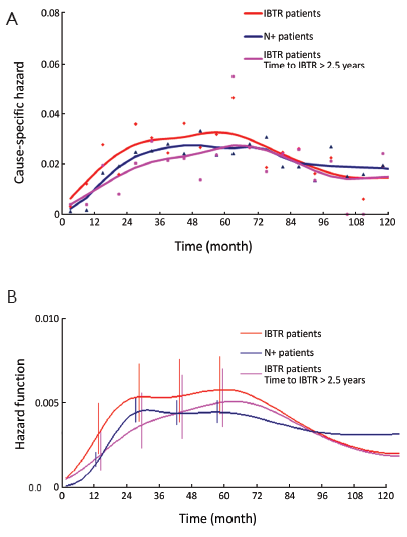 To further investigate the analogy between the clinical course of IBTR patients and N+ patients, we analyzed the mortality dynamics, regardless of the surgical approach. The resulting hazard rate curves (Figure 5) display a very similar pattern with a modestly increased level for IBTR patients during the first 6-7 years. However, when the analysis was performed for patients with time to IBTR exceeding 2.5 years, the resulting hazard rate curve was virtually identical to the corresponding curve of N+ patients.