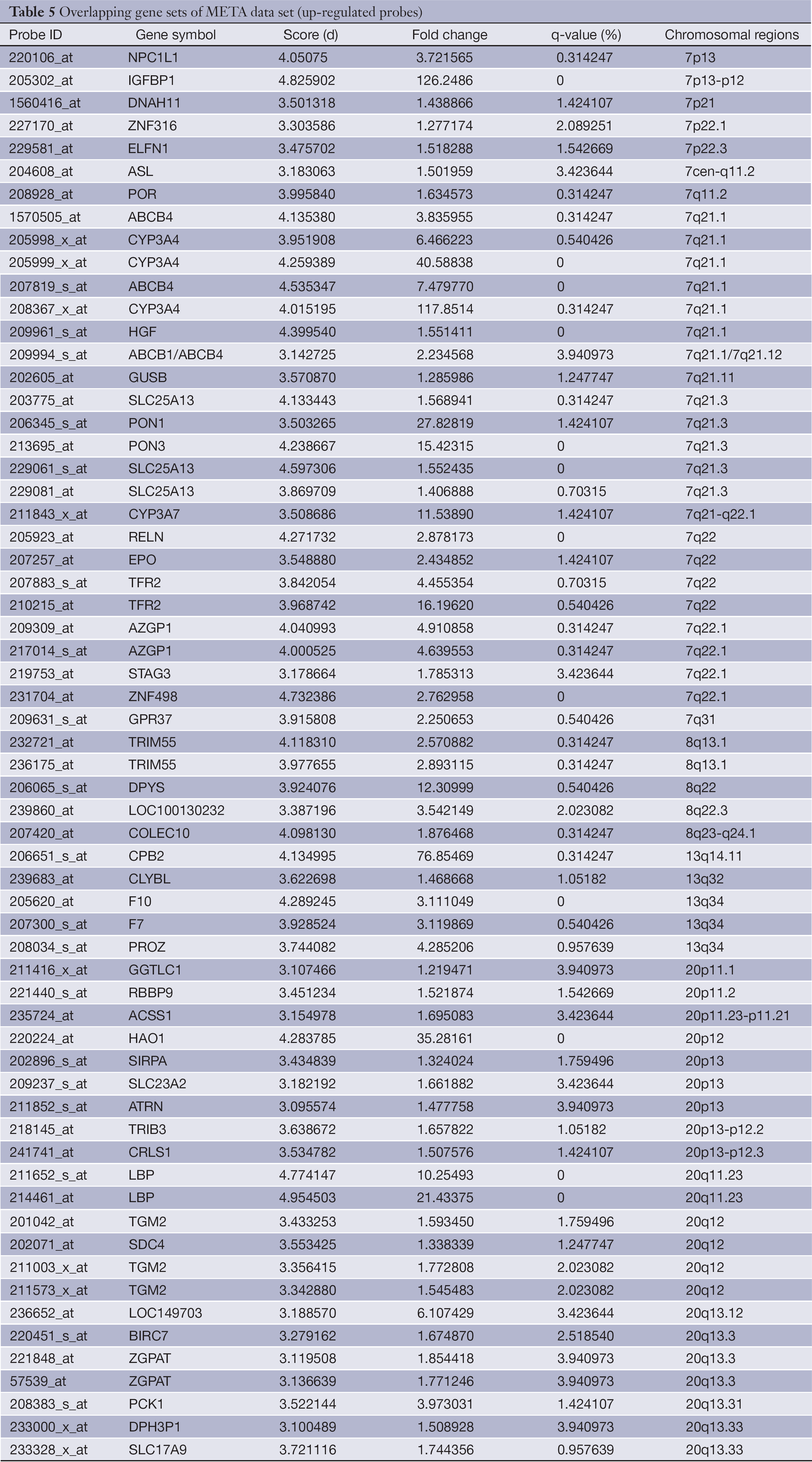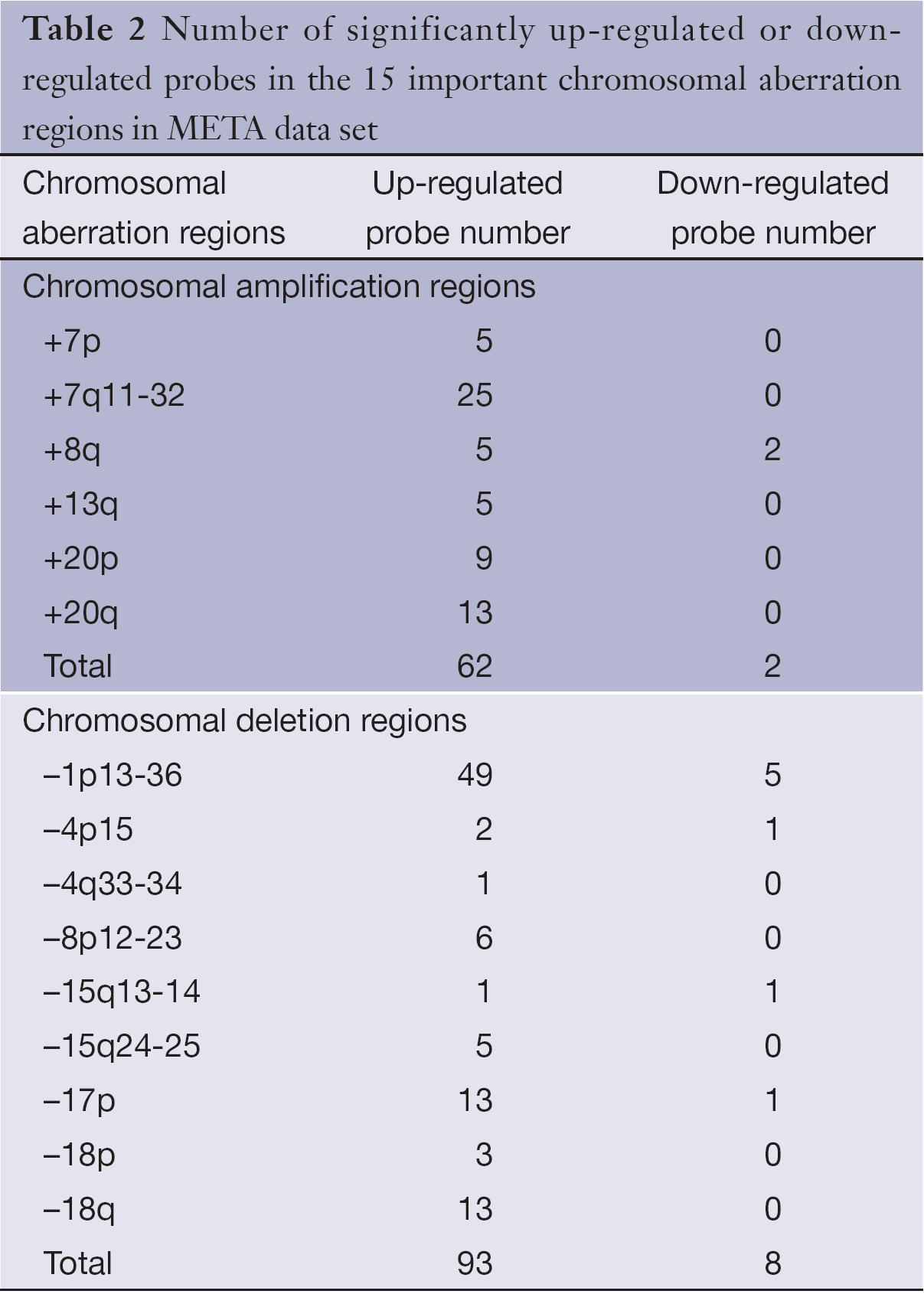 The overlapping gene sets were selected in which the gene expression changes and copy number changes were consistent. In other word, up-regulated genes were selected in chromosomal amplification sites, and down-regulated genes were selected in chromosomal deletion sites. The overlapping gene sets were obtained in PRI data sets (Tables 3,4) and META data sets (Tables 5,6), respectively.