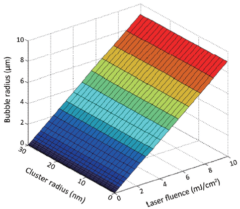 Laser fluence at the maximum level of 15 mJ/cm2 hits the cluster size of radius 30 nm and produces the maximum number of nanobullets (Figure 6). These bullets hit the tumor and generate bubbles with a radius of 9 µm. Such fluence level and bubble size provide high selectivity of killing the breast cancer cells (24,25).