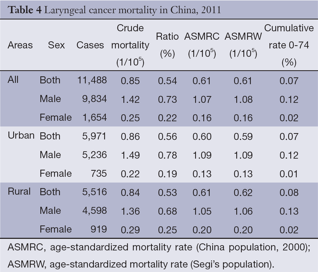 Cancer of larynx was the second most common cancer in head and neck following oral cavity cancer, as well as the second most frequently cancer occurred in respiratory tract except lung cancer (1,2). According to GLOBOCAN 2012, there were an estimate of 156,877 new cases and 83,376 deaths in the world, and the adjusted incidence and mortality rates were 2.1/100,000 and 1.1/100,000, respectively. However, nearly 12.76% of global laryngeal cancer cases and 14.65% of cancer deaths occur in China owing to the huge population (3). Larynx is a specialized area and involved in breathing, sound production, and protecting the trachea against food aspiration. Cancer of larynx significantly affects the quality of life and causes serious disease burden to public health in the long run. In this article, we provided the estimated numbers of new cases and deaths of laryngeal cancer in 2011 in China, as well as a comprehensive overview of cancer incidence, mortality and cumulative risk of developing or dying from cancer before 75 years of age using the most current population-based data available.