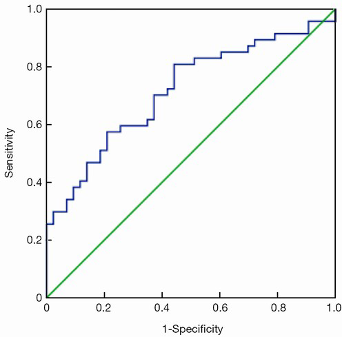 ROC curves are shown in Figure 1 (HE4) and Figure 2 (CA125). The areas under the curve (AUCs) of HE4 and CA125 in predicting suboptimal debulking vs. OD were 0.716 [95% confidence interval (95% CI): 0.611-0.822] and 0.599 (95% CI: 0.481-0.717), respectively. But there was no statistically significant difference by MedCalc analysis (P=0.080) (Figure 3). The most suitable clinical HE4 cut-off value was 473 pmol/L. At an HE4 cut-off value of 473 pmol/L, the analysis reached a sensitivity of 81% and a specificity of 56% for predicting suboptimal debulking with PPV of 67%, NPV of 73%, positive likelihood ratio of 1.84 and negative likelihood ratio of 0.34. Of the 57 patients with HE4 ≥473 pmol/L, OD was not achieved in 38 (67%) patients. Of the 33 patients with HE4 <473 pmol/L, OD was not achieved in 9 (27%) patients (P<0.001). At a CA125 cut-off value of 500 U/mL, the analysis reached a sensitivity of 80% and a specificity of 40% for predicting suboptimal debulking with PPV of 59%, NPV of 65%, positive likelihood ratio of 1.34 and negative likelihood ratio of 0.50. The relationship between clinical characteristics and cytoreductive outcomes are shown in Table 2.