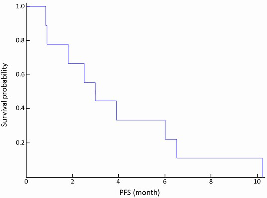 With a median follow-up period of 15 (range, 5-35) months, the median progression-free survival (PFS) was 3.0 [95% confidence interval (CI): 1.5-4.5] months (Figure 1). The median overall survival (OS) was 11.8 (95% CI: 8.9-14.7) months (Figure 2).