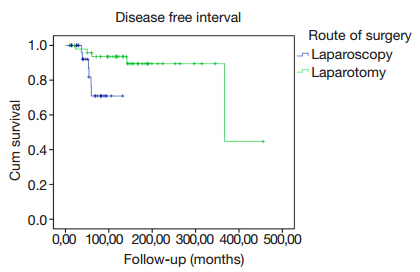 When we analyzed the disease free interval we observed significant better outcomes in the group of laparotomy compared to laparoscopy (P=0.015) (Figure 1).