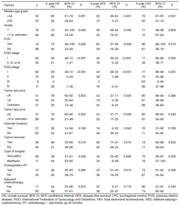 In univariate analysis (Table 4), age <54 years, previous uterine disease (PUD), grade 1 ( vs. others), FIGO stage (I vs. others, and FIGO I vs. II vs. III vs. IV), tumor size ≤8 cm (vs. others) were found to be favorable prognostic factors for OS and DFS (Figure 2); while vascular invasion and tumor necrosis were unfavorable prognostic factors only for DFS. FIGO stage I disease was the only favorable prognostic factor for LRC.