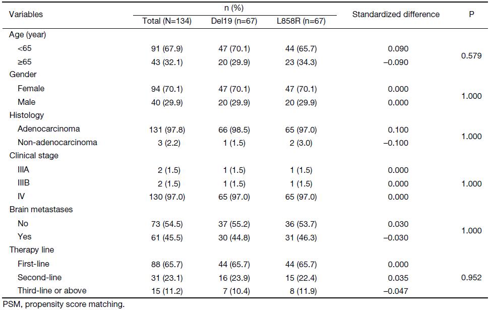 Although there were some reports showing that EGFR-TKI treatment was more effective in the Del19 group than in the L858R group, results on the survival differences between Del19 and L858R mutation subtypes remained inconsistent (14,15). In this study, we investigated the characteristics and survival outcomes of Del19 and L858R mutation patients receiving gefitinib. In contrast to prior studies, we performed rigorous adjustment for baseline differences by PSM to overcome the impact of bias and potential confounding factors in this retrospective study. After PSM, the 67 patients in the Del19 group and the 67 patients in the L858R group were well matched. This ensured that our study conclusion was more solid and convincing.