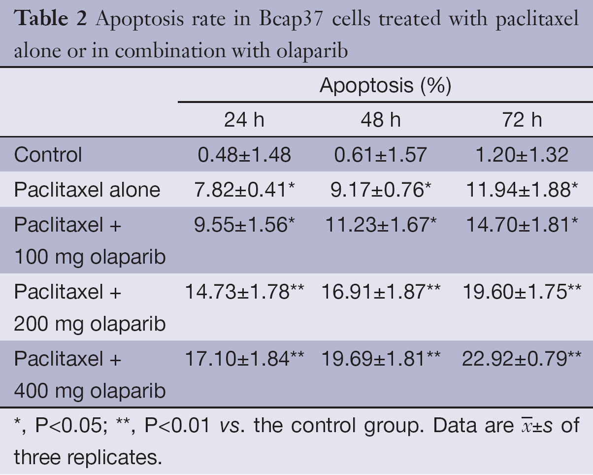 We assessed the proliferation and apoptosis of Bcap37 cells treated with paclitaxel alone or in combination with olaparib. The results suggested that PARP inhibitors and paclitaxel function by different mechanisms, but both inhibit tumor proliferation and promote apoptosis; in combination, they yield a synergistic effect. Pro-caspase-3 is a key mediator of apoptosis and PARP is the main substrate for caspase-3; both are important in DNA damage repair and apoptosis. Our study showed that increasing the dose of olaparib led to increased degradation of pro-caspase-3 and PARP, thus confirming that olaparib induces Bcap37 apoptosis. Combined paclitaxel and olaparib inhibited DNA damage repair and may provide an ideal drug option for chemotherapy, although additional research is needed to determine the mechanism of the actions.