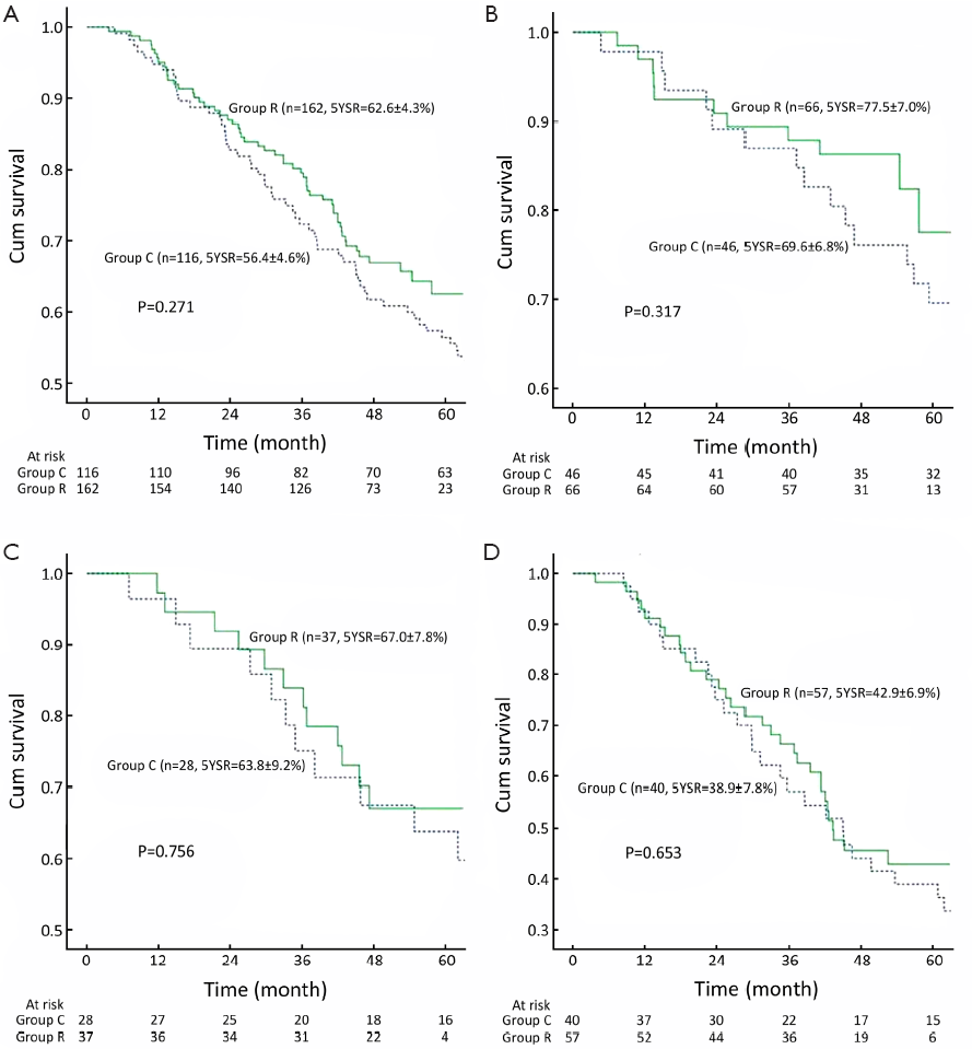 The Kaplan-Meier OS curves are depicted in Figure 1. Control group had a similar outcome compared with Research group. The 5-year OS rates were 56.4±4.6% in Control group and 62.6±4.3% in Research group (P=0.271, Figure 1A). Significant differences in OS were not observed between Control group and Research group when the patients were stratified into stage I (Figure 1B), stage II (Figure 1C) and stage IIIa (Figure 1D). The difference in DFS between Control group and Research group was not significant in the whole group (Figure 2A) and in stage IIIa patients (Figure 2B). However, DFS in stage I (Figure 2C) and stage II (Figure 2D) patients tended to be longer in Research group.