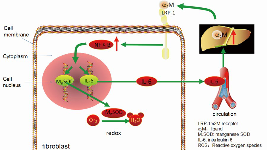 Combined with radiation-induced fibrosis theory, the antioxidant effect of α2M on radiation injury may be as follows (Figure 2). α2M binds LRP-1 on the fibroblast membrane and sends the signal to NFκB and promotes the nuclear translocation of NFκB and binds to target genes (MnSOD and IL-6 genes), and then the expression of MnSOD and IL-6 increases. MnSOD scavenges O2– by catalysing its conversion to hydrogen peroxide and oxygen. IL-6 enters the blood circulation and reaches the liver to induce the synthesis of α2M. Then, α2M binds LRP-1 on the fibroblast membrane again.