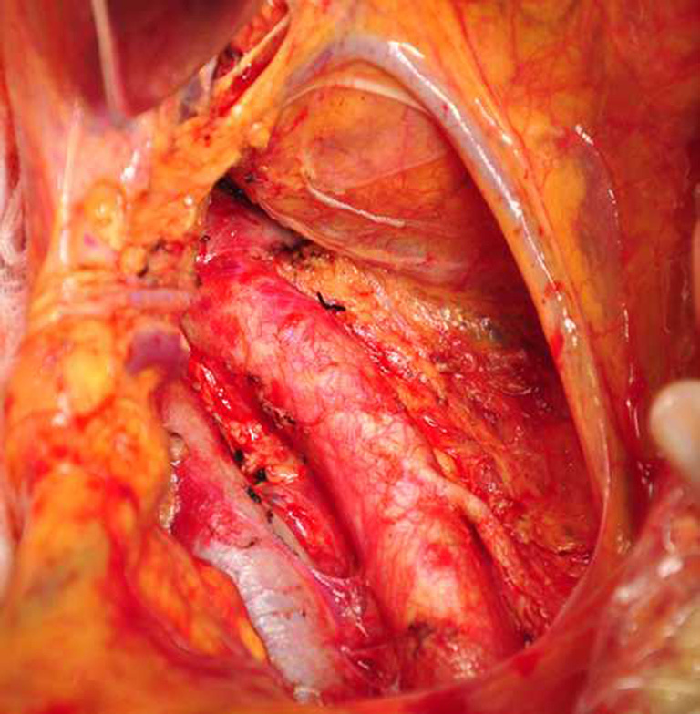 Lift the transverse colon upwards to expose the inferior mesenteric vein. Open the retroperitoneum along the left edge of the inferior mesenteric vein. Thus, the posterior portion of the mesopancreas became visible (Figure 5). The level of inferior mesenteric artery was defined as the lower border of the resection of the posterior portion of the mesopancreas. After the dissection of the connective tissues around the superior mesenteric artery, the dissection continued upwards along the anterior side of the abdominal aorta till 2 cm above the root of celiac trunk, which was defined as the upper border of resection of the posterior portion of the mesopancreas. Then, the connective tissues around the celiac trunk were dissected. The connective tissue between the inferior vena cava and the abdominal aorta should be carefully dissected. Furthermore, the left genital vein was set as the left posterior border for the resection of mesopancreas and the inferior mesenteric vein as the left anterior border. After the jejunum was transected 15 cm away from the ligament of Treitz, the anterior and posterior sections of the mesopancreas had been completely divided; only the junction between the anterior and posterior sections (the head of the pancreas and the uncinate process of the pancreas) was connected with the superior mesenteric artery and vein. Divide and ligate the vessels in the uncinate process of the pancreas, and then dissociate the uncinate process. Pull away the uncinate process to expose the superior mesenteric artery at the left side of the superior mesenteric vein. Turn over the superior mesenteric artery in the first branch of jejunum to expose the right side of the superior mesenteric vein. Then, the lymphatic and nerve tissues around the superior mesenteric artery were dissected till its root. Separate and ligate the small blood vessels in the uncinate process to complete the en bloc resection of the head of the pancreas, duodenum, and the anterior and posterior sections of the mesopancreas; if necessary, resection and reconstruction of the vessels were also performed (Figure 6). After three-dimensional marking of the cutting edges, the surgical specimens were sent for pathology.