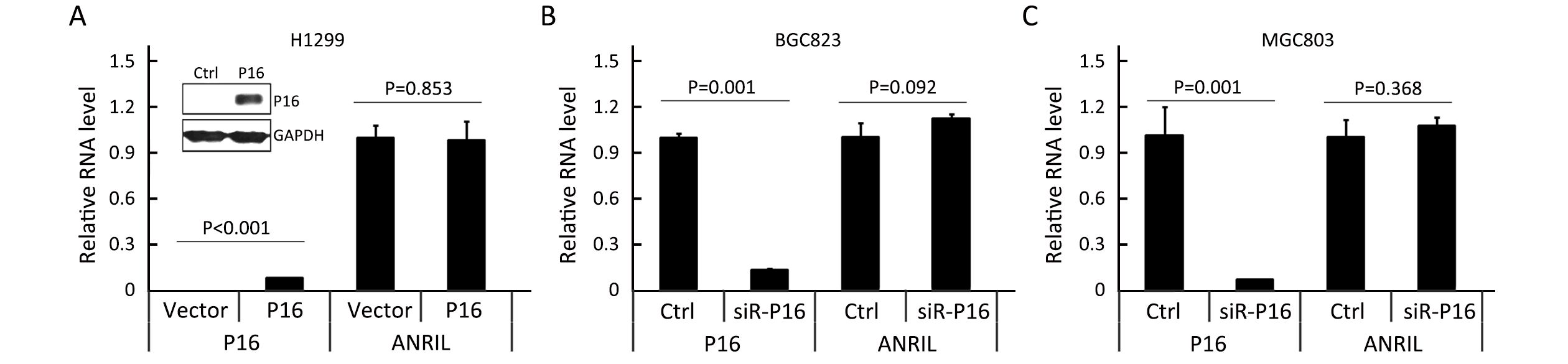 To clarify whether downregulation of ANRIL expression is directly caused by P16 DNA methylation itself or indirectly caused by subsequent P16 repression, we induced P16 expression changes in H1299 and BGC823 cells through transient transfection, and found that the ANRIL level remained stable following P16 overexpression and siRNA knockdown (Figures 6A, B), respectively. Similar result was also obtained in MGC803 cells (Figure 6C). These data suggest that it is P16 methylation itself, but not P16 downregulation, that leads to the repression of ANRIL transcription.