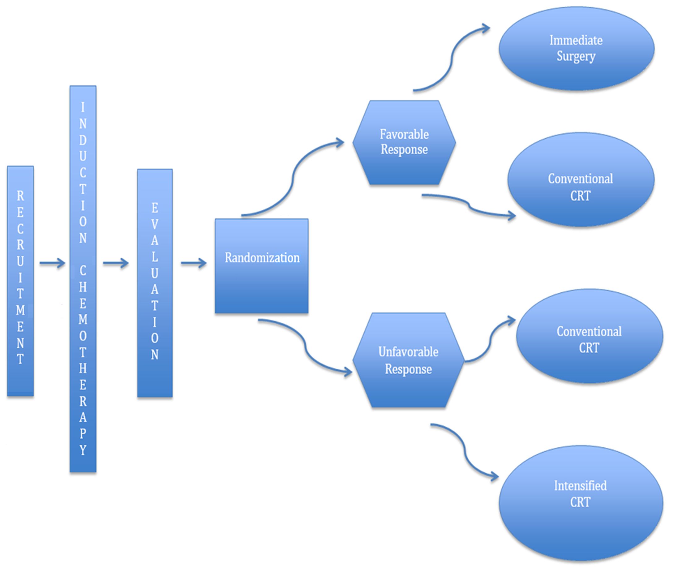 The use of a more intensified neoadjuvant regimen is a promising alternative in enhancing systemic control and improving treatment compliance. Induction chemotherapy, which refers to systemic chemotherapy given before LCRT and surgery, emphasizes the potential of chemotherapy in treating micrometastases, thereby reducing the incidence of distant recurrence and improving survival. The purpose of induction chemotherapy is to reduce distant relapse by early treatment initiation, allow downstaging of the primary tumor, and identify aggressive tumors that would not respond to treatment (22). Given that it takes 16–19 weeks following CRT to initiate systemic chemotherapy, it is imperative that upfront chemotherapy be started in patients who are likely to require chemotherapy as part of their treatment (23). Theoretically, the early administration of chemotherapy would inhibit the development and dissemination of metastatic disease and reduce the incidence of distant recurrence (2). This makes induction chemotherapy particularly appealing, as it may improve long-term outcomes.
